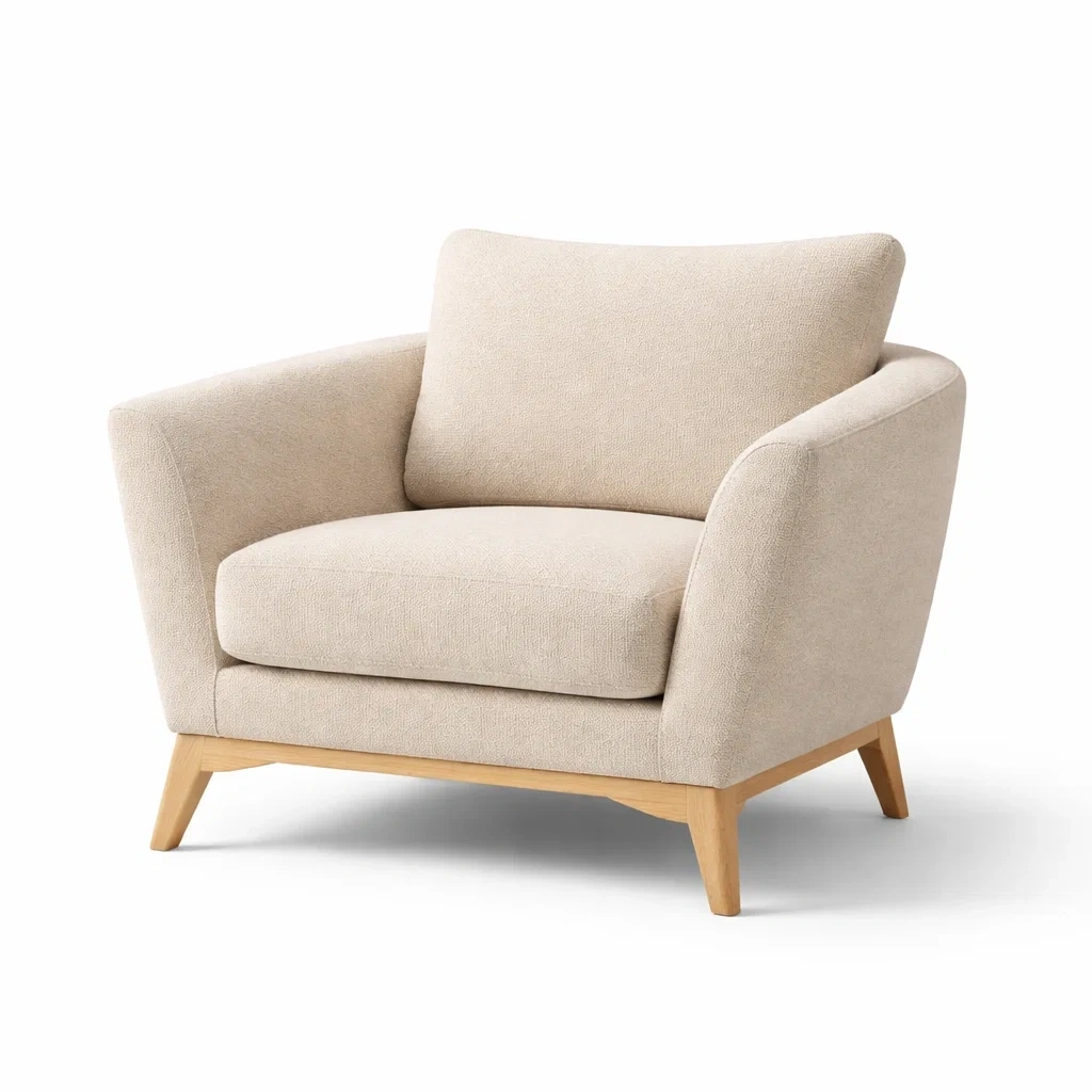 Fauteuil tissu polyester beige avec pieds en bois de chêne